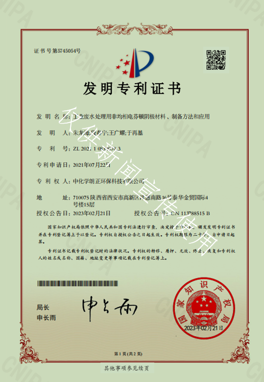 近日,由中化学朗正环保科技有限公司申请的《工业废水处理用非均相电芬顿阴极材料、制备方法和应用》发明专利获国家知识产权局正式授权,并于2023年2月21日发布了授权公告,专利号为“ZL 202110832070.3”。这是中化学朗正持续推进生态环保科技创新工作,尤其是推进工业废水治理细分技术领域研究工作所产出的阶段性科技成果之一。