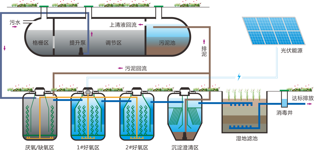 多级生物接触氧化MOCOP一体化设备单台处理规模10~250t/d不等,可根据设计处理规模进行并联,满足不同的设计要求。适用于居住集中且周边难于接入市政管网的村庄。