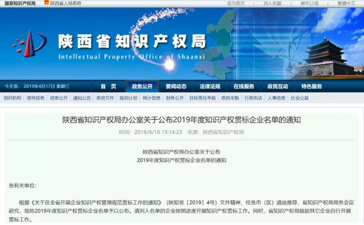 入围陕西省知识产权局知识产权贯标企业!