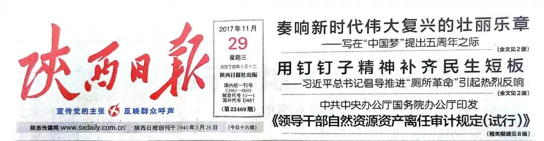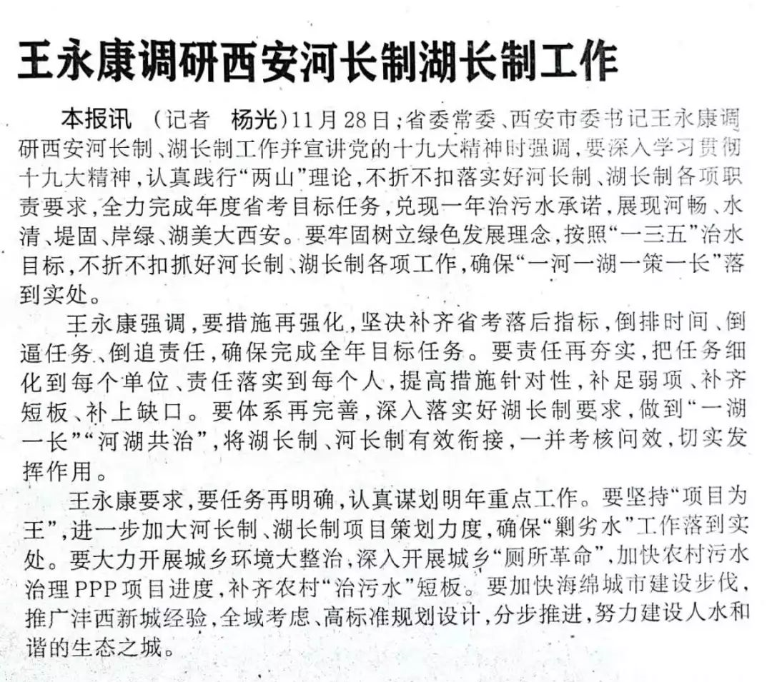 2017年11月29日,《陕西日报》第22469期第3版报道了陕西省委常委、西安市委书记王永康在调研西安河长制、湖长制工作并宣讲党的十九大精神时强调,要深入学习贯彻十九大精神,认真践行“两山”理论,要大力开展城乡环境大整治,深入开展城乡“厕所革命”,加快农村污水治理PPP项目进度,补齐农村“治污水”短板。