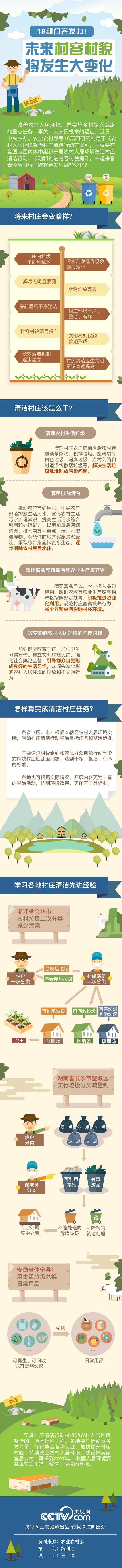 央视网消息:改善农村人居环境,是实施乡村振兴战略的重点任务,事关广大农民根本的福祉。近日,中央农办、农业农村部等18部门研究制定了《农村人居环境整治村庄清洁行动方案》,强调要在全国范围内集中组织开展农村人居环境整治村庄清洁行动,带动和推进村容村貌提升。一起来看看今后村容村貌将会发生哪些变化?