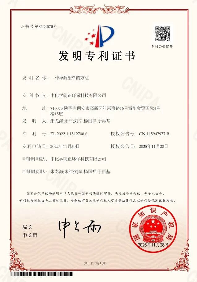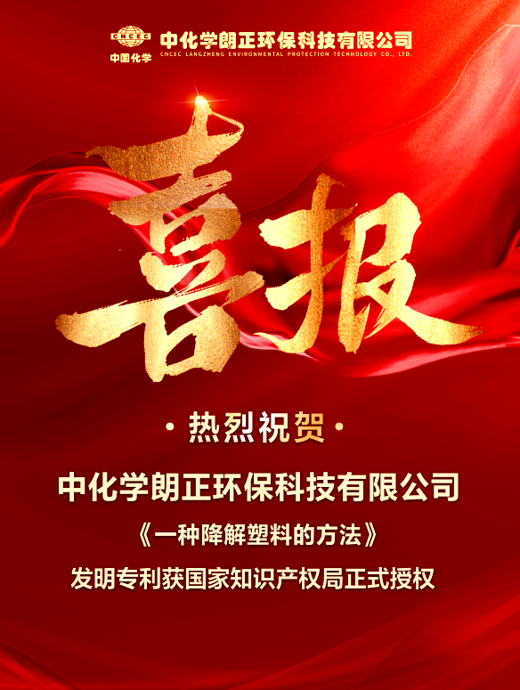 近日,由中国化学城投公司朗正公司申请的《一种降解塑料的方法》发明专利获国家知识产权局正式授权(专利号:ZL 2022 1 1512708.6)。