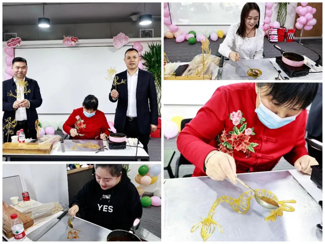 活动邀请西安市非遗传承人为大家带来了精彩的糖画表演,全体女职工身临其中、积极踊跃参与,感受这份独特的“甜蜜”。糖画传承人以勺为笔,以糖为墨,铝板作纸,勺随意动,任情挥洒,动作娴熟流畅,行云流水间,一幅幅栩栩如生的糖画作品生动呈现在女职工面前,可观可食,亦画亦糖,寓意着中化学朗正大家庭甜甜蜜蜜的生活,象征着中化学朗正蓬勃发展、蒸蒸日上的发展目标和宏伟愿景。
