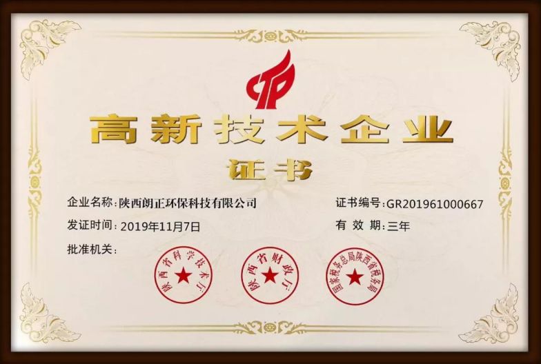 近日,朗正环保收到了由陕西省科学技术厅、陕西省财政厅、国家税务总局陕西省税务局联合颁发的“国家高新技术企业”认定证书,由此企业正式迈入了国家高新技术企业行列。本次被评定为国家高新技术企业,是政府相关机构对朗正环保多年来自主创新、自主研发所取得成果的肯定,这是一份荣誉也是一份鞭